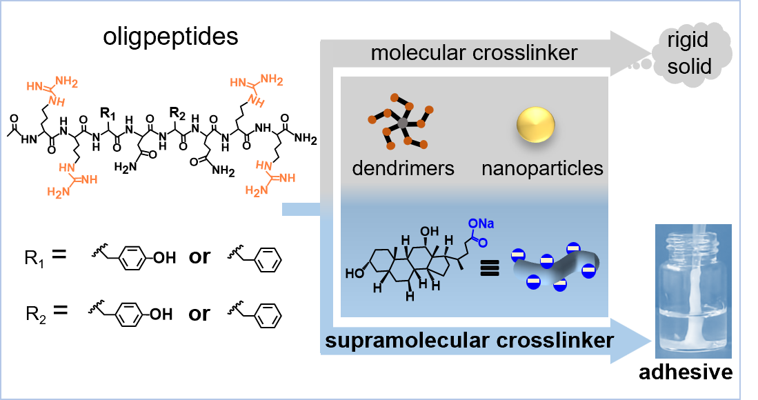 胶体型超分子交联剂构建寡肽仿生水下胶黏剂的示意图