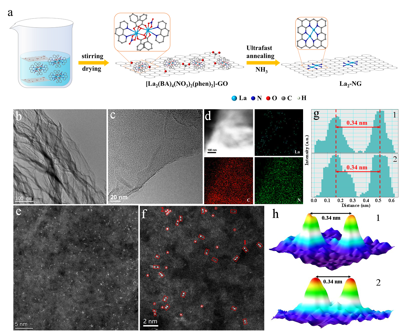 通过在焦耳超快加热装置上的快速热解使合成的[La2(BA)4(NO3)2(phen)2]前体上的双原子La2位点嵌入到N掺杂的石墨烯上,合成了双原子La催化剂(La2-NG)(图1a)。HAADF-STEM结果证实了稳定的耦合La双原子结构的存在。图1e,f显示了La2位点的形成,碳衬底上存在成对的La亮点。