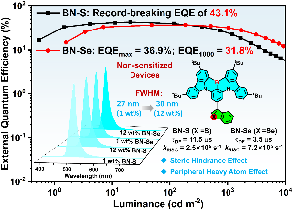 BN-S和BN-Se在甲苯溶液中表现出窄谱带发射(FWHM ~ 22 nm)和接近100%的荧光量子产率,最大发射峰分别为483和485 nm。同时相比于BCzBN(kRISC=1.4 × 10⁴ s⁻¹),BN-S和BN-Se的kRISC显著提升至2.5 × 105和7.2 × 105s⁻¹。将BN-S和BN-Se作为发光客体制备的非敏化OLED分别实现43.1%和36.9%的最大外量子效率以及27和28 nm的半峰宽。BN-S器件的表现出非常小的效率滚降,在100和1000 cd m-²亮度下,外量子效率分别保持在36.7%和31.8%,为非敏化二元MR-TADF-OLED器件中的较高水平。这一工作为开发高性能MR-TADF分子提供了新的分子设计思路。