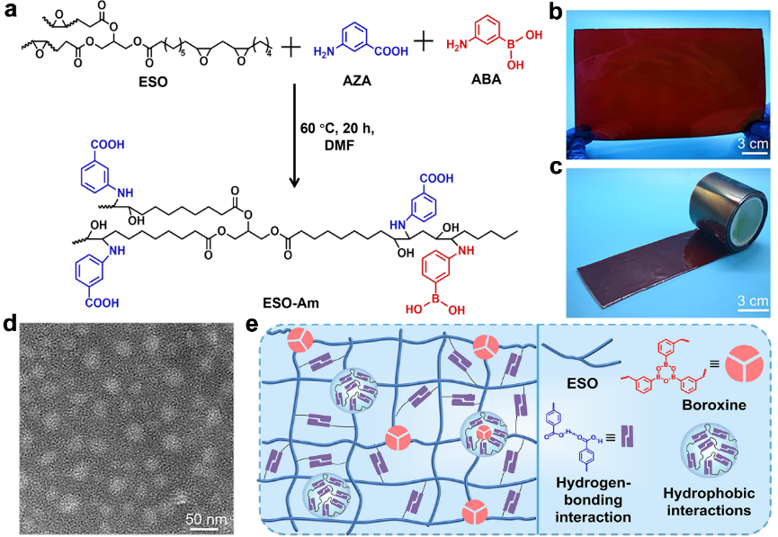 图1.a)ESO-Am的合成。b)尺寸30 cm ×20 cm的ESO-Am粘合剂。c)ESO-Am双面胶带。d)经磷钨酸钠溶液染色的ESO-Am粘合剂切片的TEM图像。e) ESO-Am结构示意图。