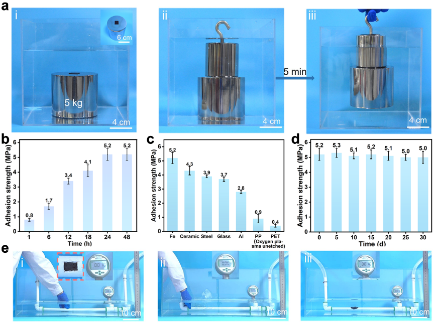 图4.ESO-Am粘合剂的水下粘合性能。a)粘合剂在5 min内提起5 kg砝码;b)不同粘合时间下的水下粘合强度;c)在多种基底上的水下粘合强度;d)粘合铁片经水中浸泡一个月后的强度保持;e)修复破损PVC水管的示例。