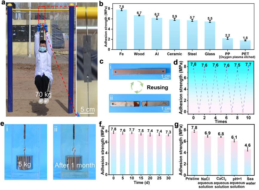 图3. a)ESO-Am粘合剂粘合的铁片(粘接面积为6 cm2)可承载一名成年人(约70 kg)。b) ESO-Am粘合剂对不同基底的粘合强度。c, d) ESO-Am粘合剂的可重复使用性能。e) ESO-Am粘合剂的长期水下粘合性能。f)粘合后的铁片在水中浸泡不同时间的粘合强度。g)粘合后的铁片在不同水溶液中浸泡24 h后的粘合强度。