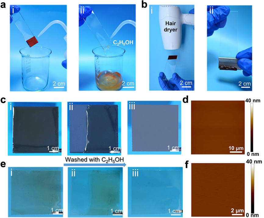 图5.ESO-Am粘合剂的按需擦除性能展示。a)乙醇冲洗去除玻璃基底上的粘合剂;b)加热并刮除实现玻璃基底擦除;c, d) ESO-Am在硅片上的部分及完全擦除及对应的AFM图像;e, f) ESO-Am在云母片上的部分及完全擦除及对应的AFM图像。