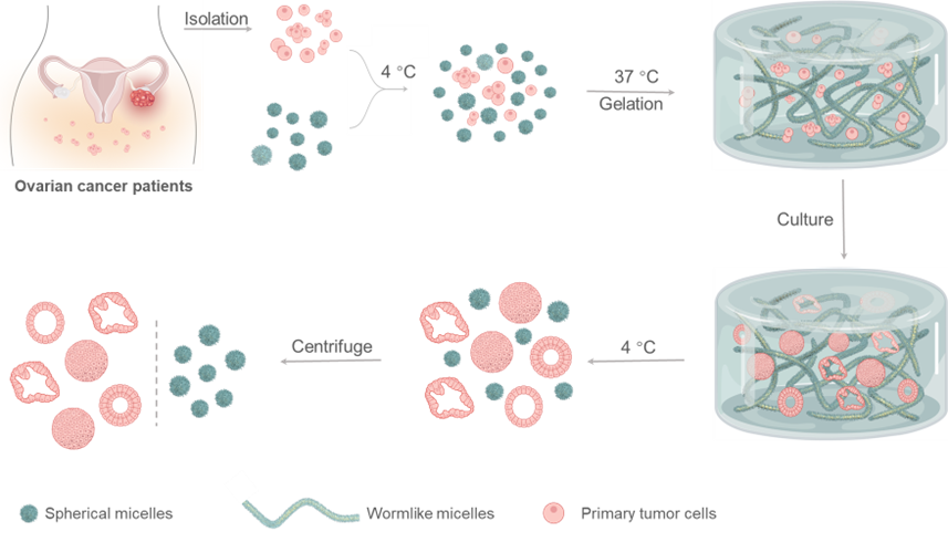 在热响应水凝胶中包埋卵巢癌细胞进行培养,并利用其可逆的LCST特性实现肿瘤类器官的形成与按需释放。(图1)