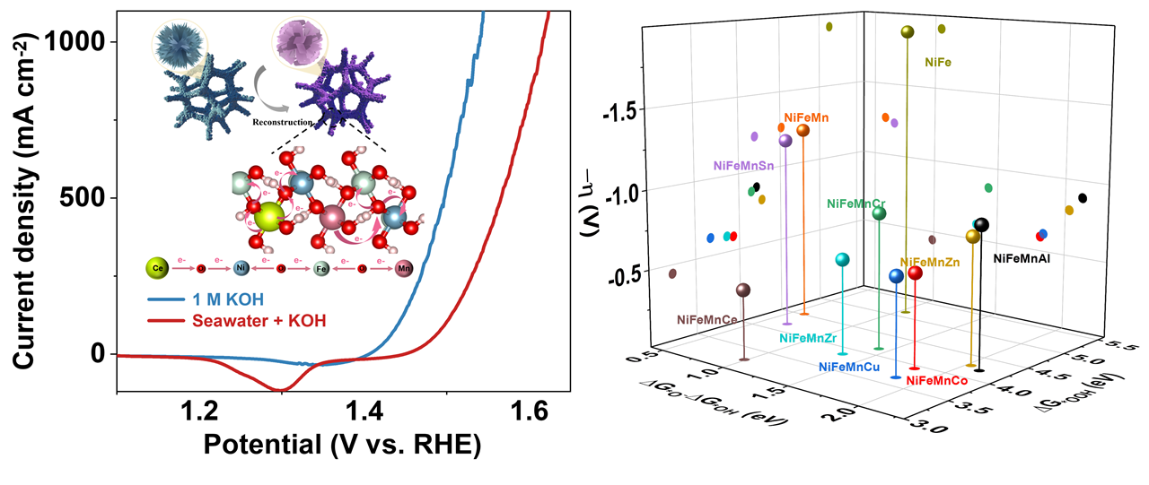 管景奇教授团队在密度泛函理论(DFT)的指导下,研究系统探讨了八种候选第四金属元素(Al、Ce、Co、Cr、Cu、Sn、Zn或Zr)对NiFeMn(O)OH电子结构和反应能的影响,揭示了Ce在优化中间吸附能和降低理论过电位方面的独特优势。该催化剂在1 M KOH中达到10 mA cm-2电流密度仅需183 mV过电位,在碱性海水中也仅需224 mV过电位。原位光谱表征揭示了Ni4+、Fe3+和Ce3+/Mn2+物种之间的动态价态演变和电荷重分布,这有助于稳定中间吸附并促进电子转移。进一步电子结构分析表明,该中熵体系在费米能级附近存在有利的d带中心和显著的自旋极化特性,二者协同增强了析氧反应(OER)动力学。研究成果以“Synergistic spin effects in medium-entropy Ni-Fe-Mn-Ce oxyhydroxides for seawater oxidation”为题,于10月17号发表在Chem. Sci.期刊上(Chem. Sci., DOI: 10.1039/D5SC05118E)。