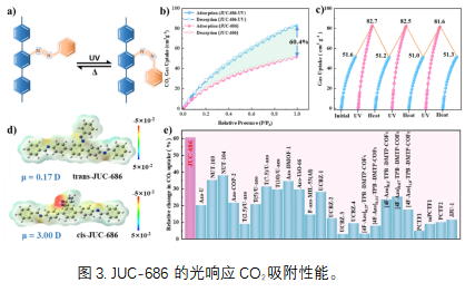其中,偶氮苯功能化的JUC-686表现尤为突出,其保持了2,131 m2g-1的高比表面积和3.09 nm的大孔径,且偶氮苯单元可实现可逆光致异构化。在273 K和1 bar条件下,经紫外光照后CO2吸附量从51.6 cm3g-1提升至82.7 cm³ g⁻¹,调控幅度高达60.4%,创偶氮苯功能化多孔材料最高纪录。