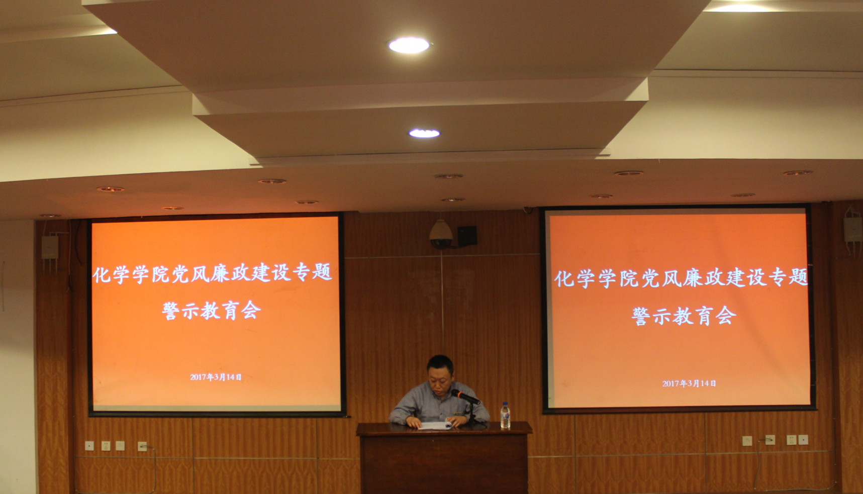 在无机超分子楼一楼圆形报告厅召开党风廉政建设专题警示教育会。会议由学院党委书记丁世海主持。