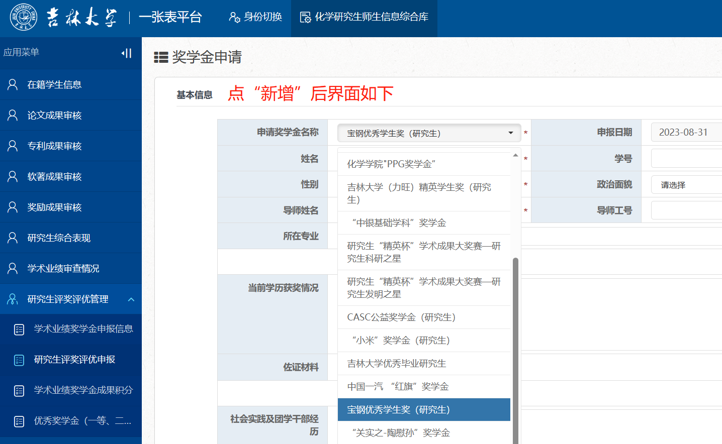 纸质版申请表及作证材料:请于9月5日前交至中心校区唐敖庆楼A201助管处;同时申报研究生于9月5日前,使用个人邮箱账号登录“一张表”平台(//one.91-cr.org),在“研究生评奖评优管理”-“研究生评奖评优申报”栏,点击“新增”进行信息填报及佐证材料上传,其中成果信息只需要输入“姓名或者学号”,然后在已审核通过的成果库中选择不超过3篇代表作参评。