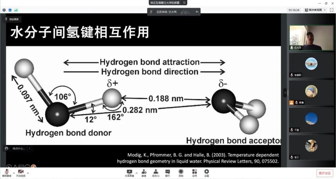汪大洋教授从一个水滴引发的思考出发,由浅入深的为同学们讲述了一系列生动有趣的探究历程:科学家们认识水、发现水物理性质的过程;随着光谱技术成熟了解到氢键、进而确定水分子结构、观察氢键赋予水的特殊性质以及从而得到一些与水有关现象为我们传递的信息等。