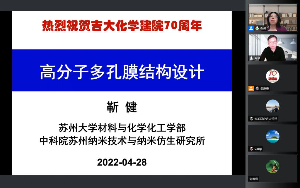 4月28日上午,苏州大学特聘教授,国家杰出青年科学基金获得者靳健应邀线上做客“吉大化学七十年——科学与未来系列讲座”,以“高分子多孔膜结构设计”为题,为学院师生作学术报告。