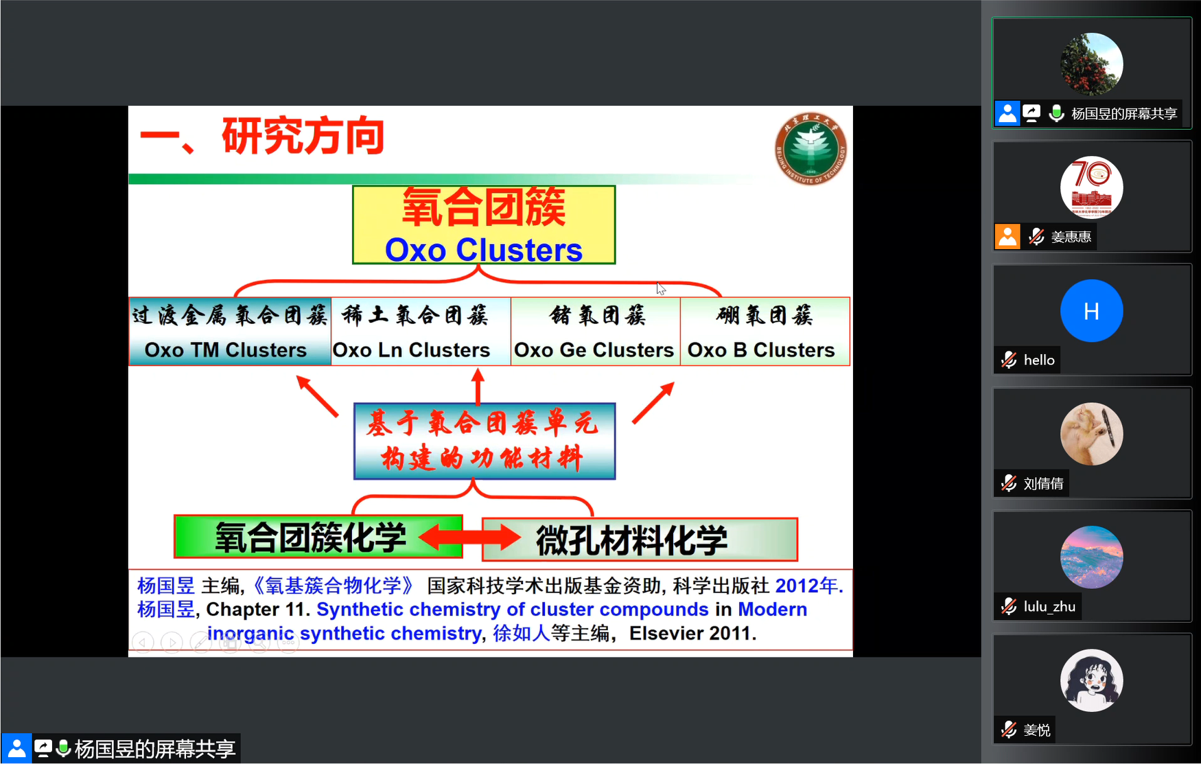 讲座中,杨国昱教授围绕氧合团簇化学,全面地介绍了其课题组在过渡金属氧簇、稀土氧簇、锗氧团簇及硼氧团簇等氧合团簇合成领域的研究进展。在交流互动环节,杨国昱教授耐心详细地解答了院内外师生的问题,并对相关领域的发展做出了展望。91成人