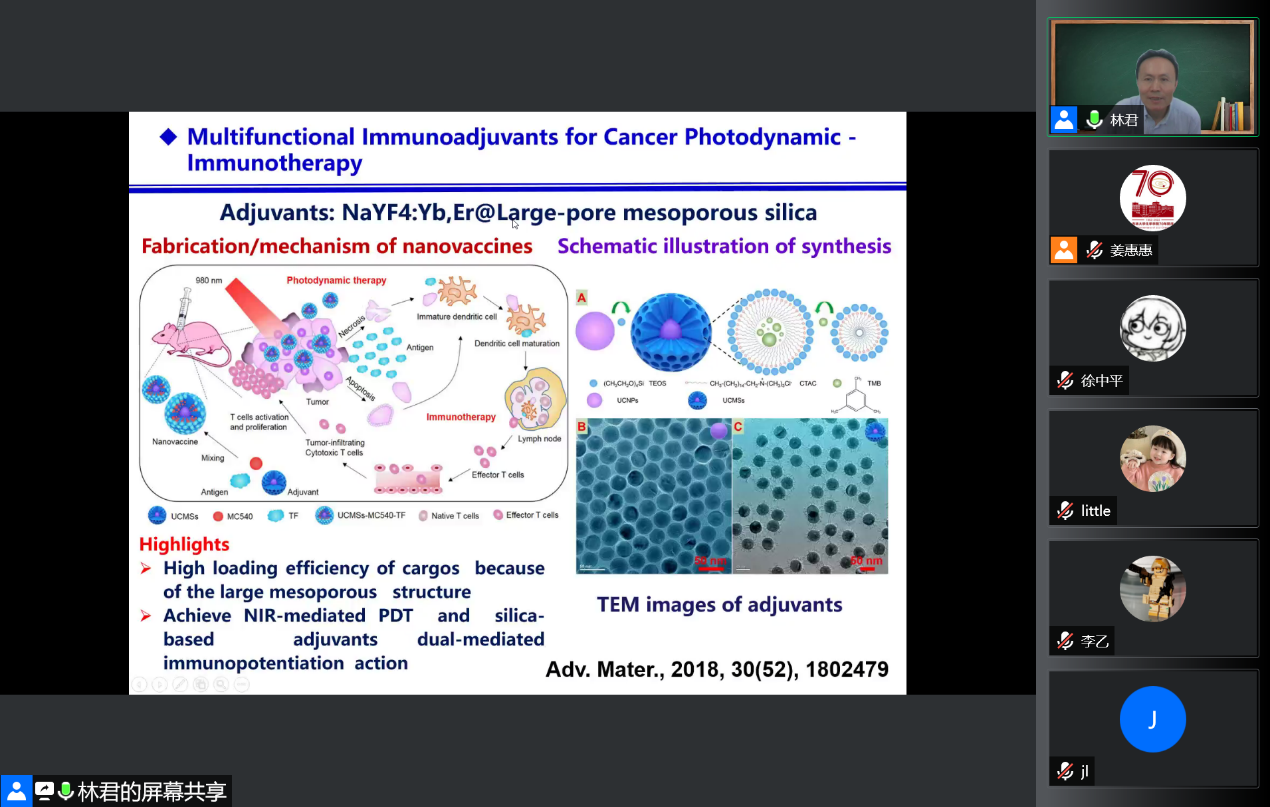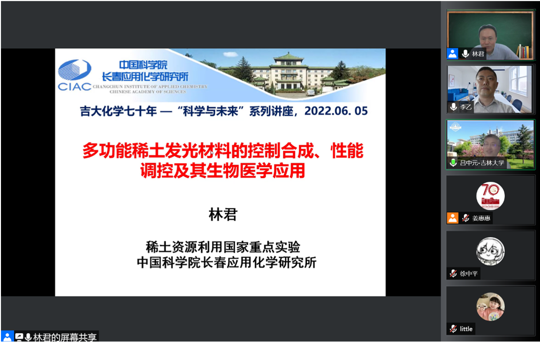 6月5日上午,中国科学院长春应化所研究员,国家杰出青年科学基金获得者林君应邀线上做客“吉大化学七十年——科学与未来系列讲座”,以“多功能稀土发光材料的控制合成、性能调控及其生物医学应用”为题,为学院师生作学术报告。