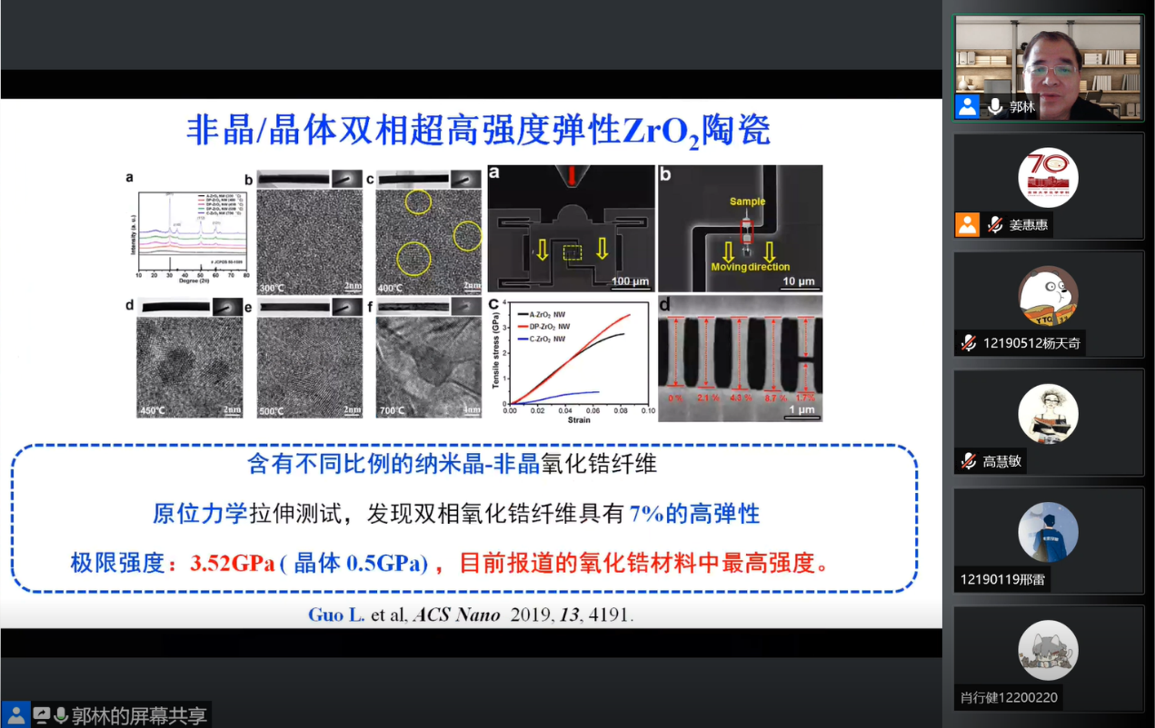 讲座中,郭林教授围绕无机非晶微纳米材料的可控合成及相关特性深入浅出地分享了其课题组在非晶微纳米材料普适制备方法,无机非晶微纳米材料光学特性、催化特性,非晶微纳米材料的力学特性及其在牙修复中的应用等方面的研究进展,展现了无机非晶微纳米材料的研究前沿及广阔的应用前景。在交流互动环节,郭林教授耐心详细地解答了院内外师生的问题,并对相关领域的发展出了展望。91成人
