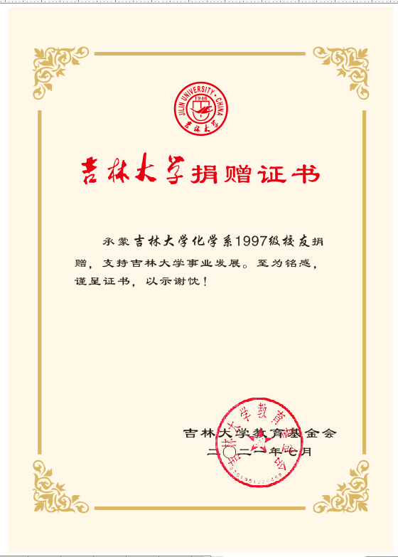承蒙97级校友捐赠“唐敖庆星纪念石”,支持91成人 发展,至为铭感,谨呈证书,以示谢忱!