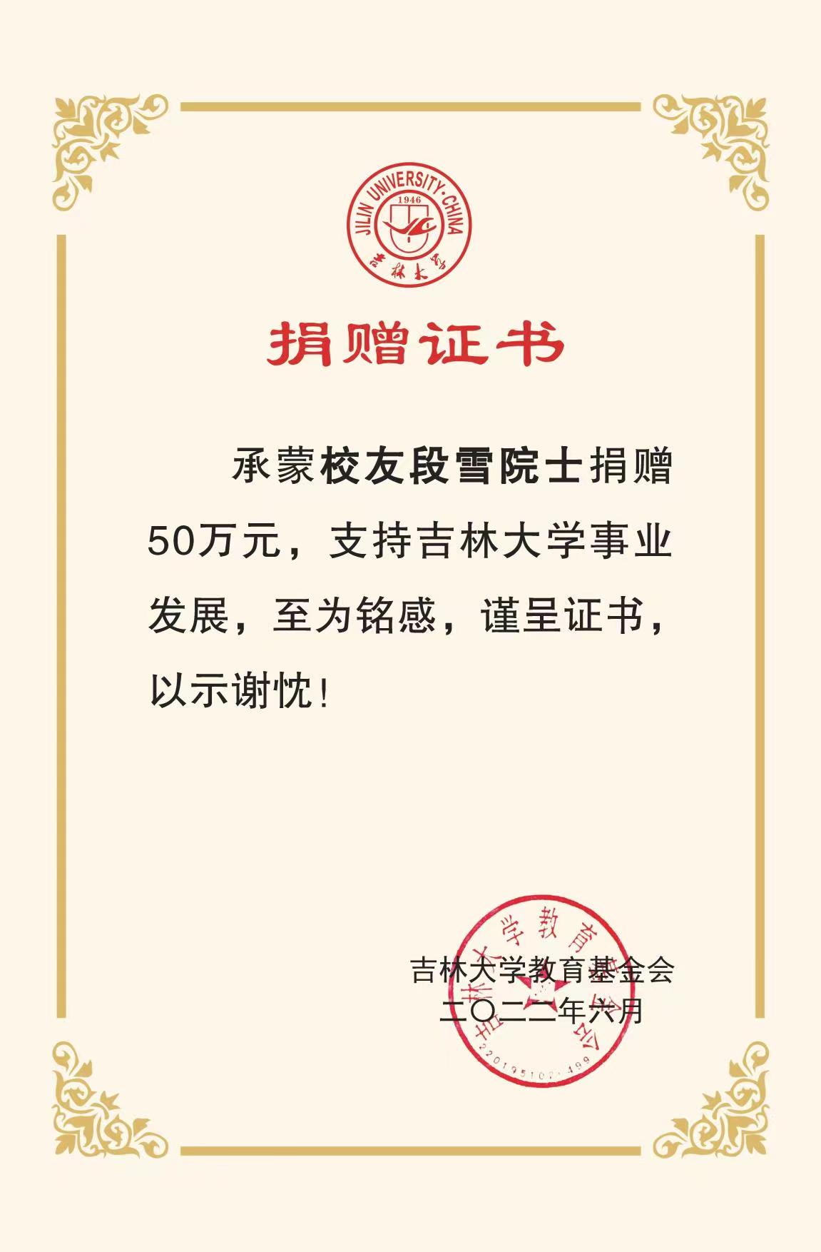 承蒙78级校友、中国科学院院士、北京化工大学段雪教授捐赠50万元,支持91成人 “关实之—陶慰孙奖学金”发展,至为铭感,谨呈证书,以示谢忱!