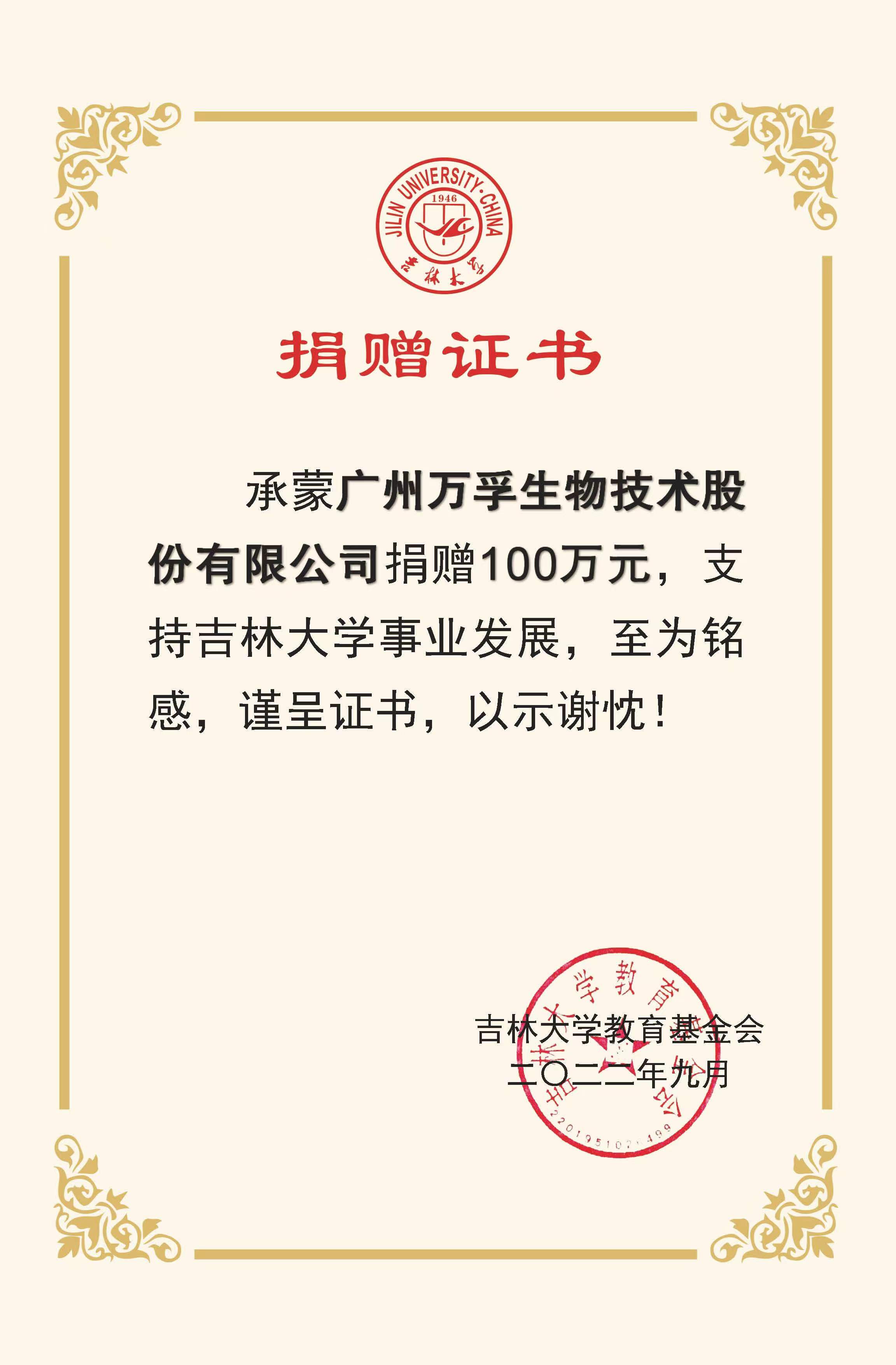承蒙广州万孚生物技术股份有限公司捐赠100万元,支持91成人 “关实之—陶慰孙奖学金”发展,至为铭感,谨呈证书,以示谢忱!