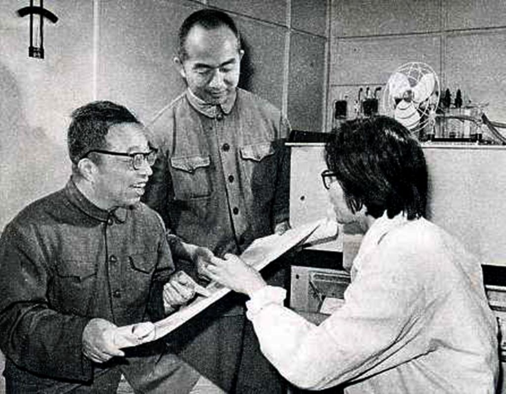 图19:唐敖庆(左)同江元生(中)等一起研究一种分子的光谱图