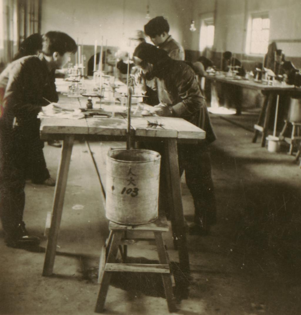 建系之初的条件极为艰苦,当时,化学系只占有一幢日伪时期建的小楼的一层。全系只有几间很小的办公室,二十几名教职工挤在一起办公,教师的数量大约只相当于北大一个教研室的人数。实验设备、仪器、药品都无从谈起。第一届学生做化学实验的地方是在地下室里。同学们围着一张木板条做成的长条桌,用墨水瓶做酒精灯,用水桶做上下水,用极为简单的仪器,进行着最基本的化学实验……