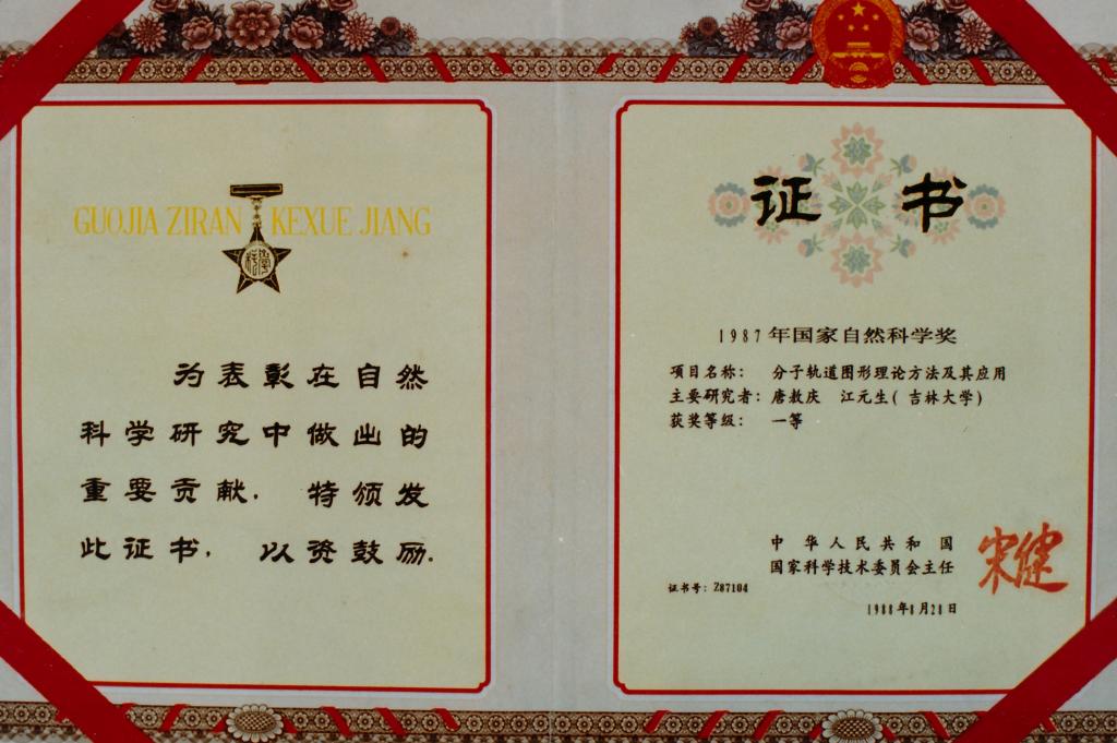 图20:唐敖庆等人获1987年国家自然科学奖一等奖证书