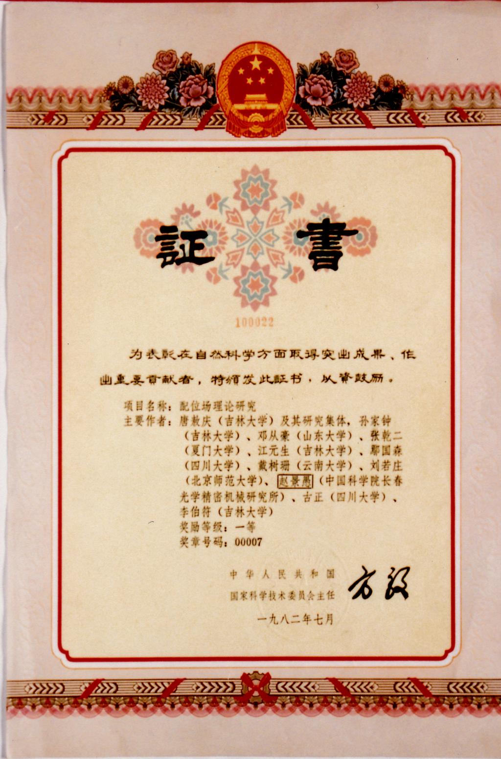 图18:唐敖庆等人获1982年国家自然科学奖一等奖证书