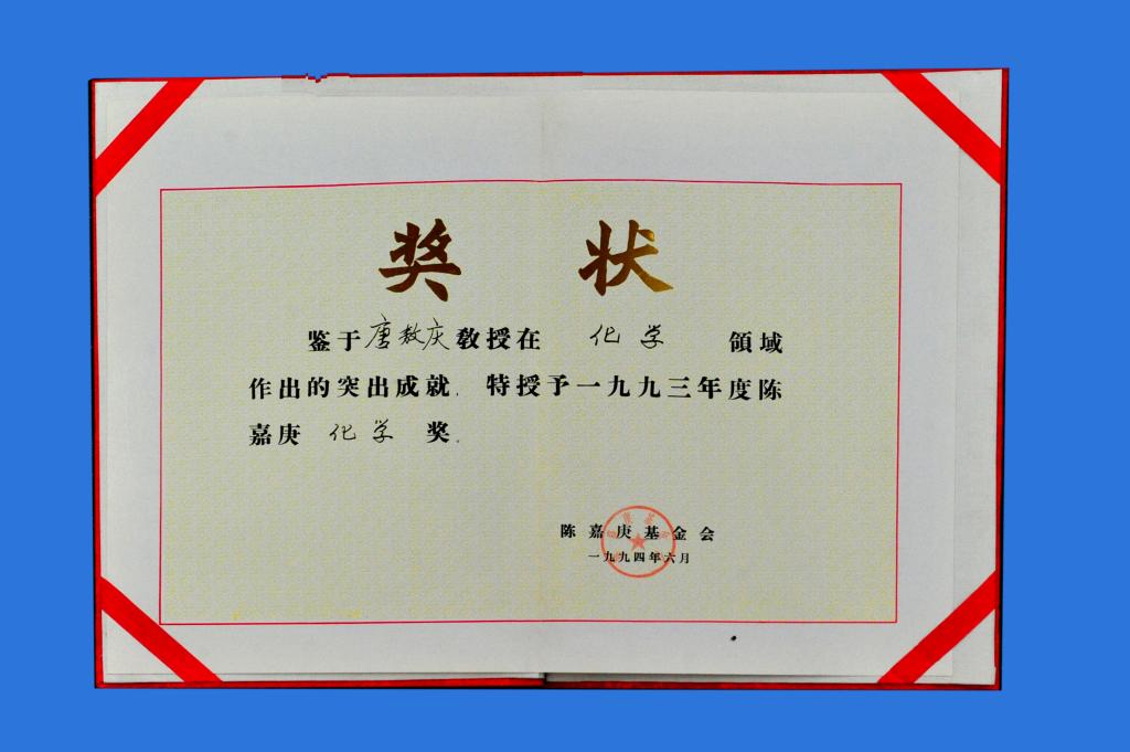 图25:唐敖庆获1993年度陈嘉庚化学奖(左)、1995年度何梁何利科学与技术成就奖(右)
