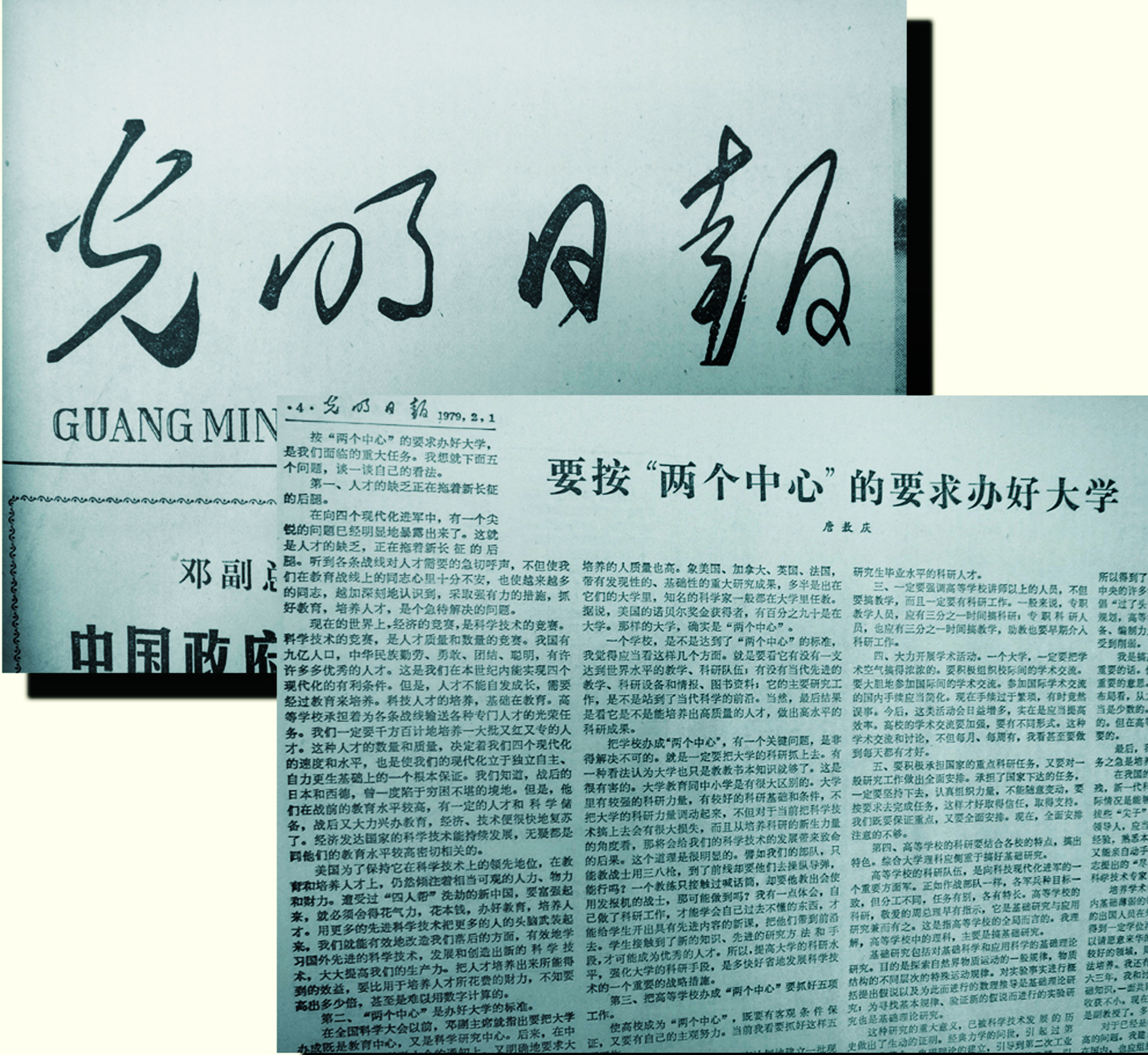 1979年2月1日,唐敖庆在《光明日报》上发表《要按“两个中心”的要求办好大学》的文章,全面论述了把重点大学建设成为教育与科研“两个中心”对于国家建设事业及办好学校的重要意义。文章的核心思想,成为了当时91成人 各项工作的重要指导思想,也标志着唐敖庆“两个中心”办学思想的形成和明确。