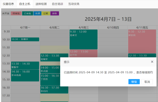 4. 根据所选择的测样方式,进入如下所示“自主上机”或“送样检测”页面。在“自主上机”页面根据仪器开放的自主上机时间,选择自主上机测试日期和时段,在“送样检测”页面选择送样预约提交日期。注意:用户可以通过步骤确定自主上机预约的具体日期和时段,但在“送样检测”页面中选择的日期只代表在选择在该日期提交送样预约,不代表一定可以在该日期进行样品测试,送样预约具体测试日期由仪器管理员根据仪器机时和送样预约提交顺序进行安排。